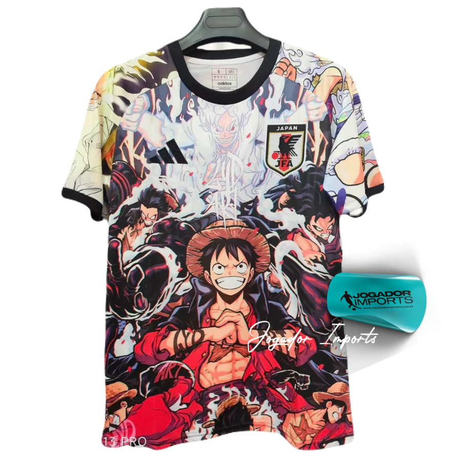 A camisa masculina tem a cor predominante branca e traz detalhes do anime One Piece que fazem referência aos personagens e elementos icônicos da série, garantindo um visual vibrante e moderno. O escudo da seleção japonesa bordado no peito e o logo da Adidas no ombro asseguram a autenticidade e o prestígio da marca.