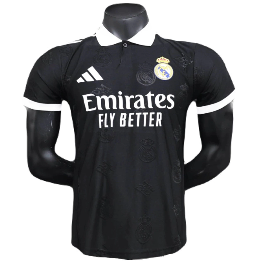 Design Exclusivo e Moderno: A combinação de cores preta e branca cria um visual elegante e ousado, com o icônico escudo do Real Madrid no peito e o logo da Adidas no lado direito, garantindo que você exiba seu orgulho de forma sofisticada.