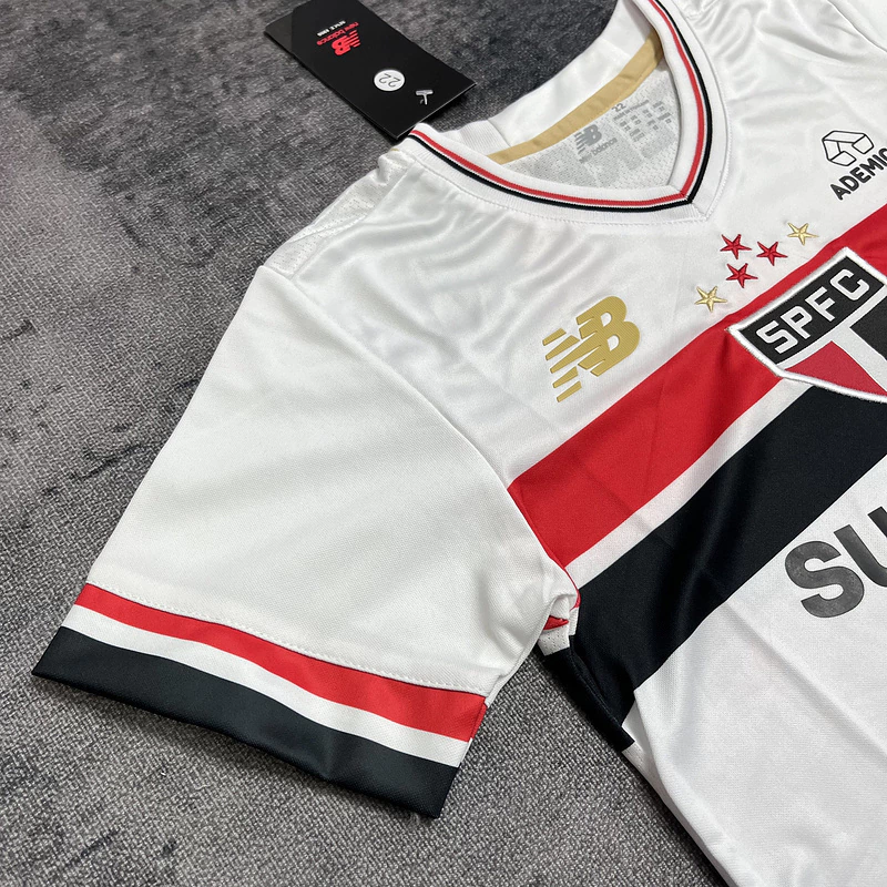 Design Tradicional: Apresenta a camisa branca com detalhes em vermelho e preto e o shorts branco, cores emblemáticas do São Paulo FC, proporcionando um visual autêntico e elegante.